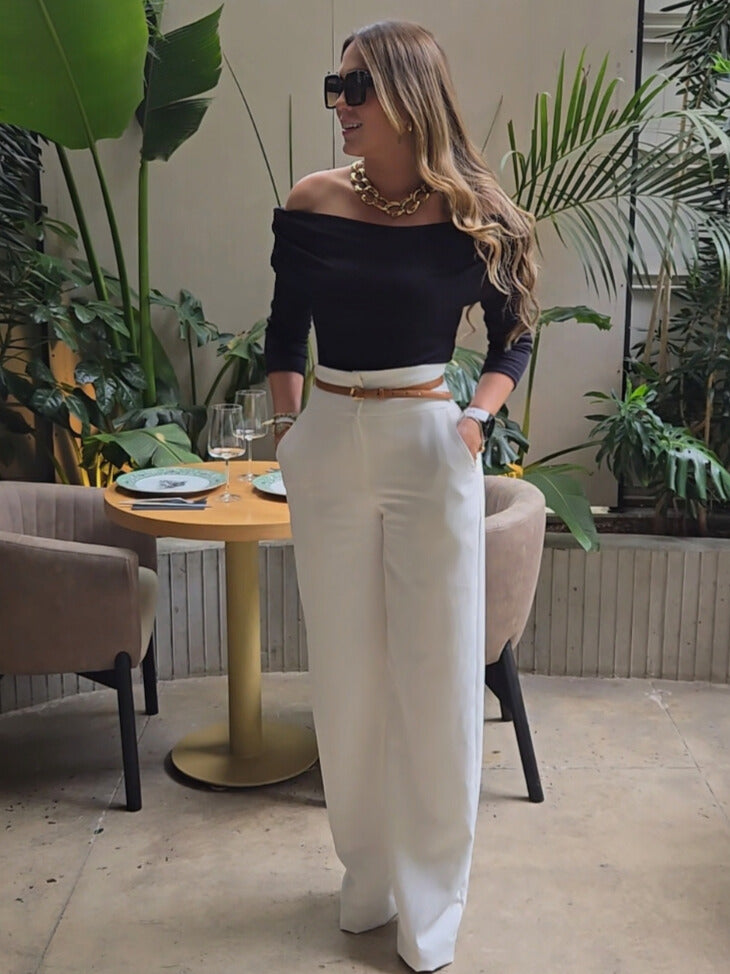 Pantalón de pretina ancha que define la cintura y realza la figura con elegancia